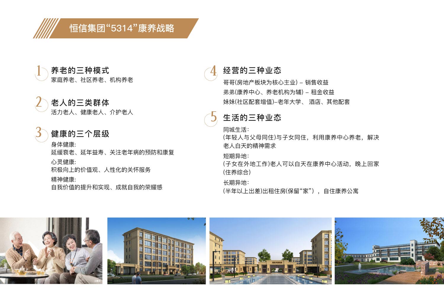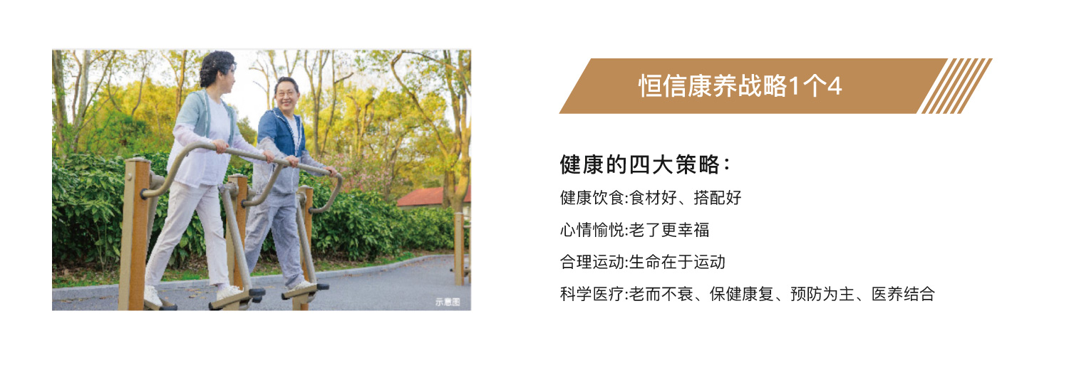 恒信集團(tuán)積極響應(yīng)十八屆五中全會(huì)提出的《“健康中國(guó)2030”規(guī)劃綱要》政策,首倡符合當(dāng)前國(guó)情“5314”康養(yǎng)戰(zhàn)略,踐行“老吾老以及人之老”的核心價(jià)值觀,打造“老有所創(chuàng),老有所為、老有所學(xué),老有所樂,老有所養(yǎng),老有所醫(yī)”的康養(yǎng)主題社區(qū)??叼B(yǎng)地產(chǎn):以“5個(gè)3、1個(gè)4”為指引,踐行“老吾老以及人之老”的核心價(jià)值觀,打造“老有所創(chuàng),老有所為,老有所學(xué),老有所樂,老有所養(yǎng),老有所醫(yī)”的康養(yǎng)主題社區(qū)。